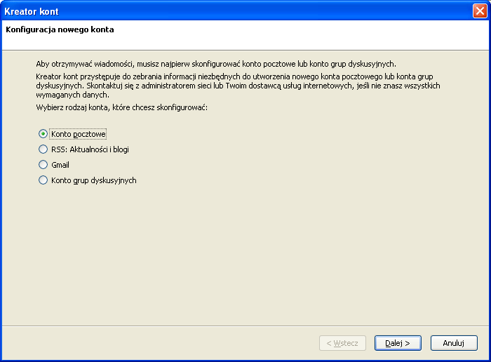 - Wybierz Konto pocztowe i kliknij przycisk Dalej.