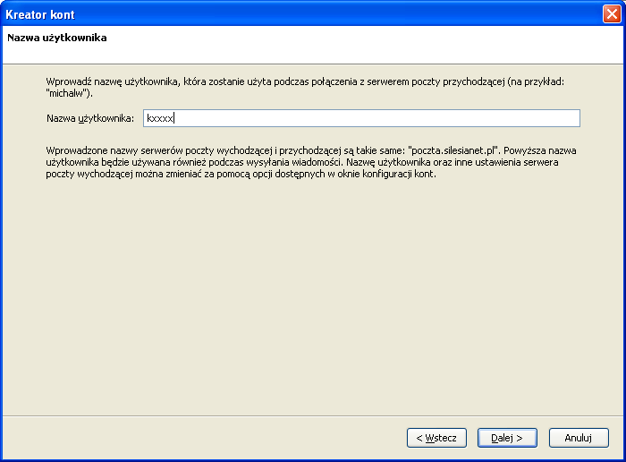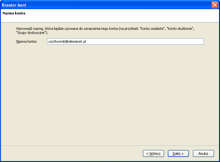 - Wprowadź swoją nazwę konta (uzytkownik@silesianet.pl) w polu Nazwa konta.