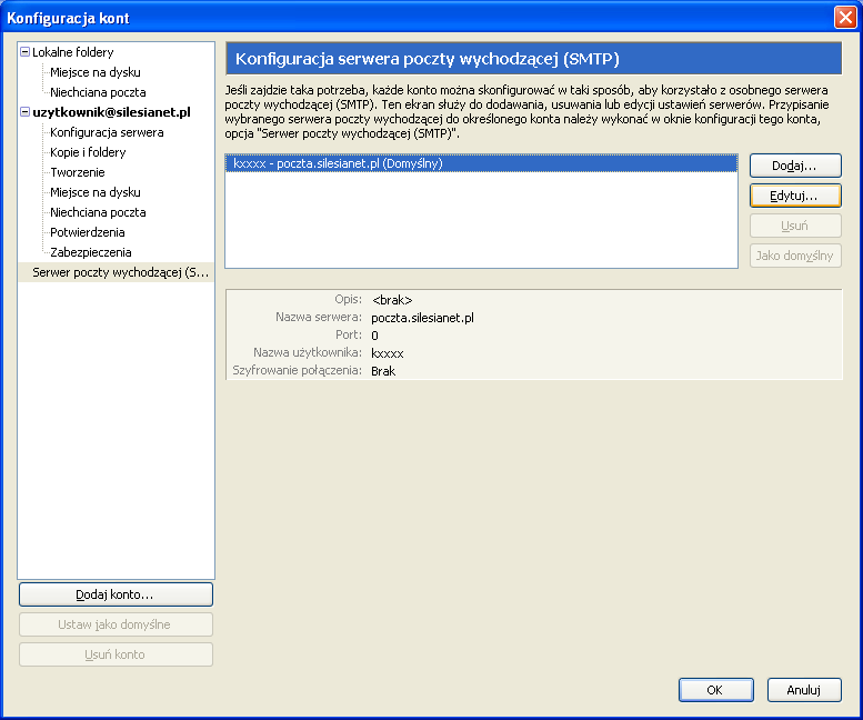 - Zaznacz pozycje poczta.silesianet.pl i kliknij Edytuj...