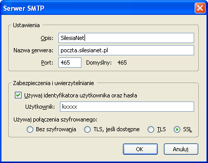 - Serwer poczty wychodzącej SMTP: poczta.silesianet.pl