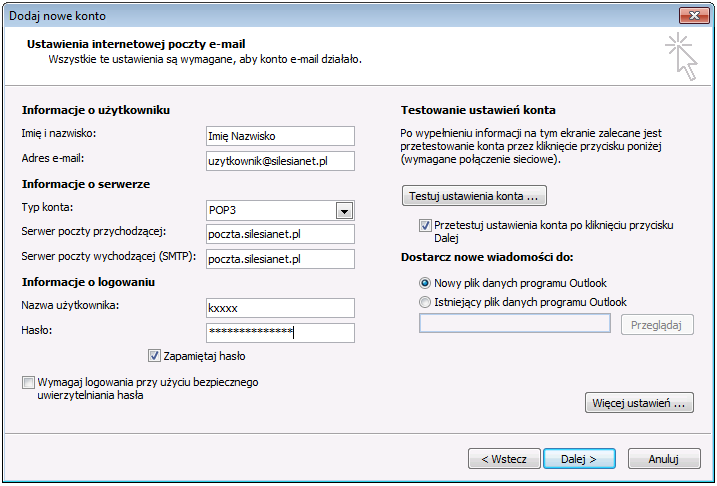 - Serwer poczty przychodzącej POP3: poczta.silesianet.pl