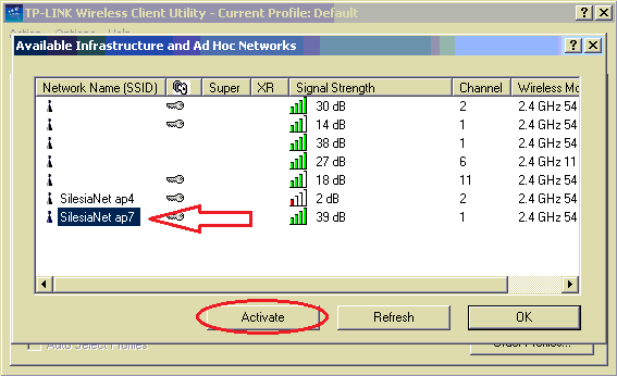 - Na liście dostępnych sieci bezprzewodowych wybieramy przypisany nam nadajnik i klikamy "Activate".
