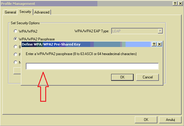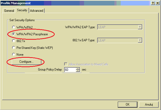 - Przechodzimy na zakładkę "Security" i zaznaczamy opcje szyfrowania "WPA/WPA2 Passphrase"