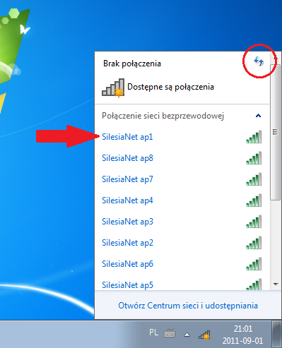 - W przypadku braku naszego nadajnika na liście, należy odświeżyć listę sieci klikając niebieskie strzałki w prawym górnym rogu.
