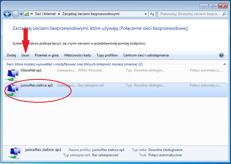- Następnie zaznaczmy zbędne sieci bezprzewodowe i klikamy Usuń