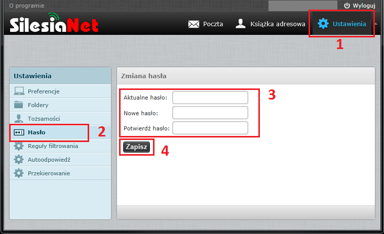 - Zaloguj się do poczty przez Webmail https://poczta.silesianet.pl